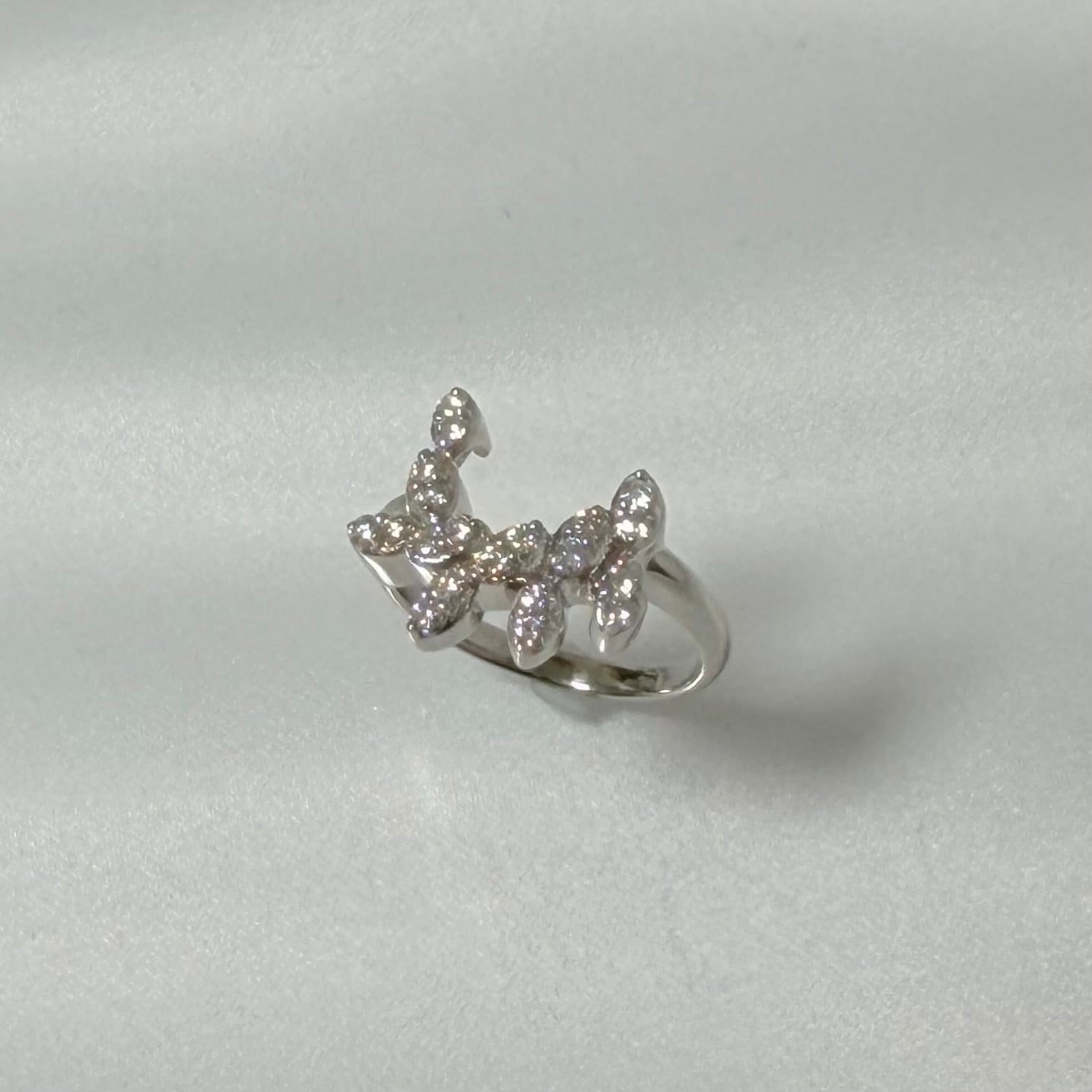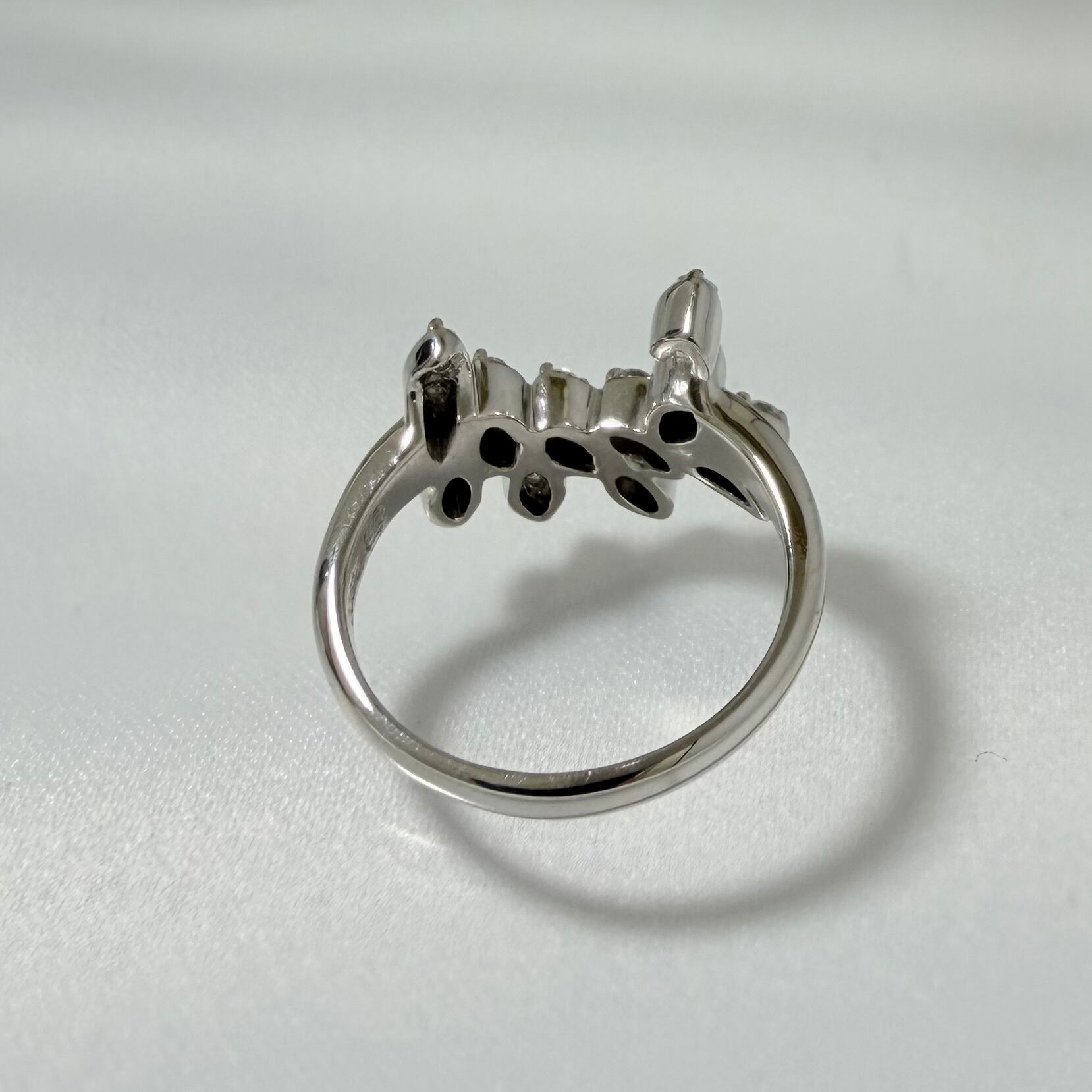 こちらは、独自のデザインが光るヴィンテージジュエリーのプラチナリングです。葉や羽を思わせるユニークなフォルムが特徴的で、0.34ctのダイヤモンドが上品にあしらわれています。個性的でありながら、日常使いにもぴったりな一品です。