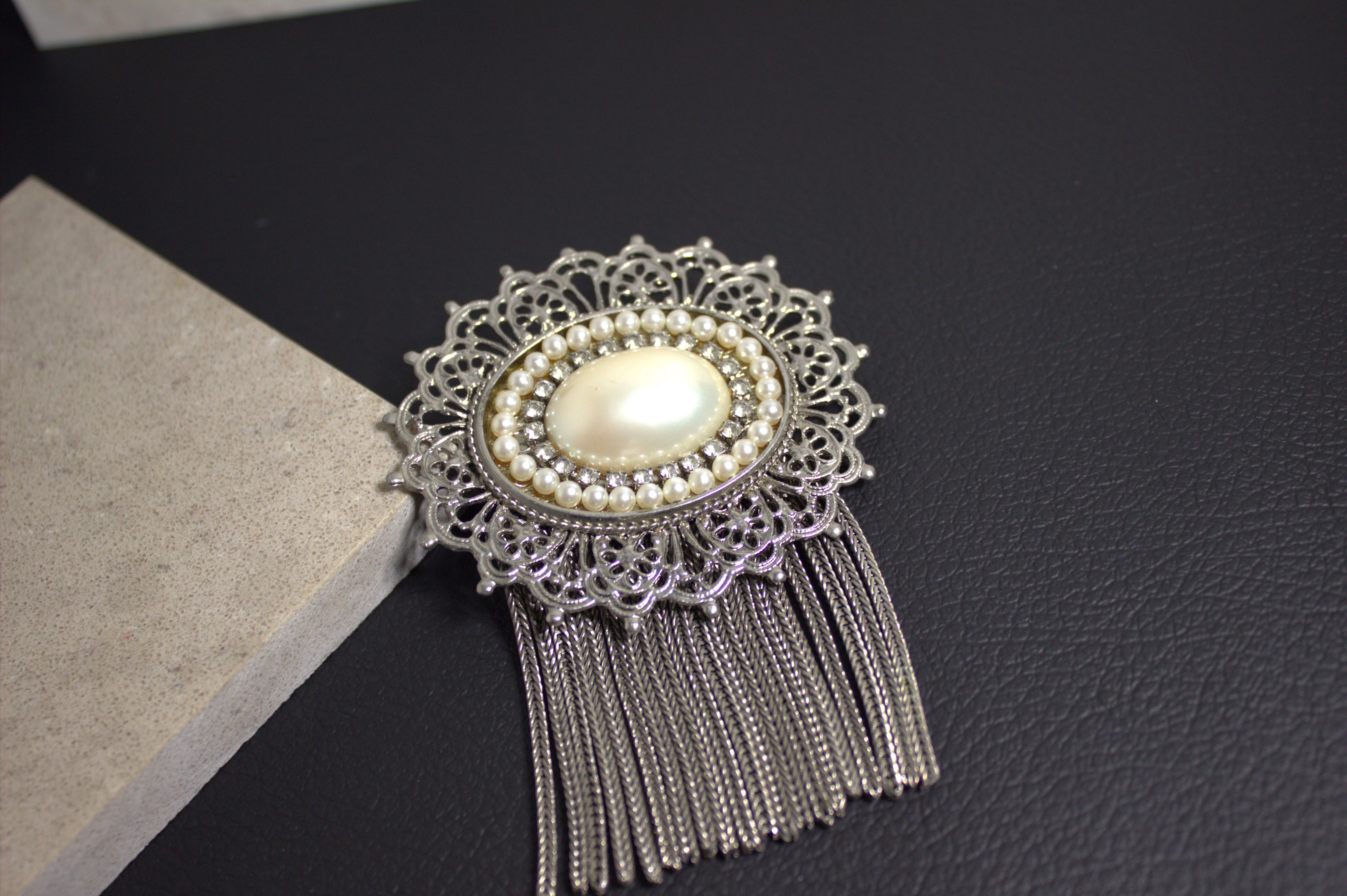 大きめのブローチは、直径約7㎝の存在感があります。アクセントとしてさりげなく楽しめるデザインです。金属のフリンジが動くたびに自由に揺れ、その様がとてもかわいらしい印象を与えます。